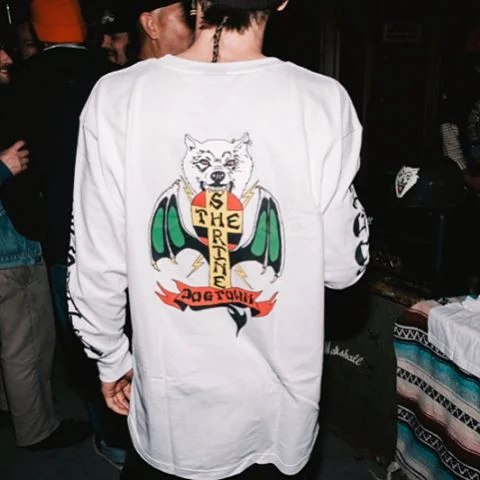 “I've known know Jim [Muir] since going to school with his son Teague at John Adams middle school and grew up skating with him. This collaboration is a dream for the brand; we've always had a far off dream of running our own skateboard company, and creating Shrine board is just as great," says lead singer of the Shrine, Josh Landau. "The cover for our album, Bless Off, has a Dogtown rip off of a lesser known graphic from Rick Clayton’s 1980’s design — it’s not one that they reissued. I called Jim to ask permission to use it for the cover and he said hell yeah! He's actually to a few of our shows. He's got the company revamped and hit me up for some board ideas. The board is like an original Dogtown board, but slightly reshaped."
