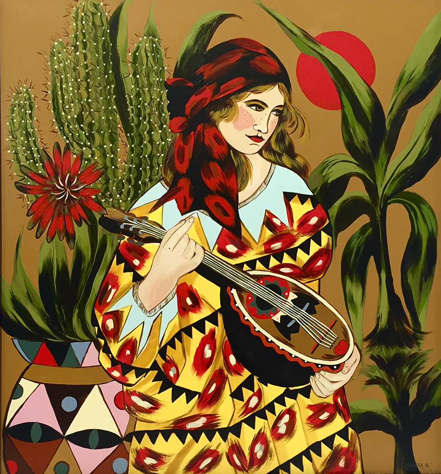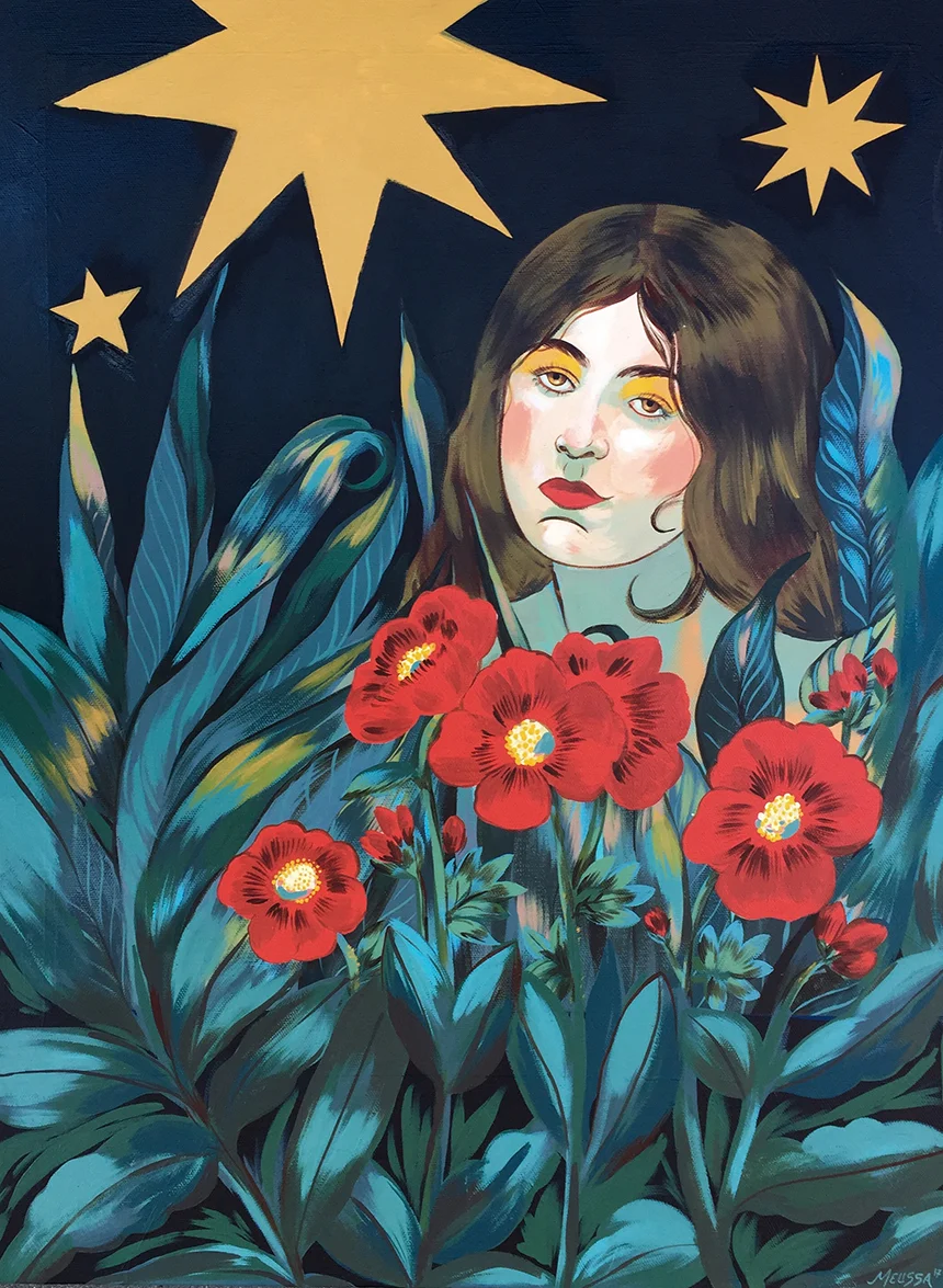 Her work reflects her interest in street art, iconography, symbolism, imagery from old children’s books, vintage ephemera and comics. She also manages the RVCA/ANP Gallery in Melbourne while continuing to paint and create in her studio at the gallery, where she most recently was working on her new body of work, "Moonflower." She's having her first solo show ever in the United States this Friday at the RVCA store on Haight and Ashbury.