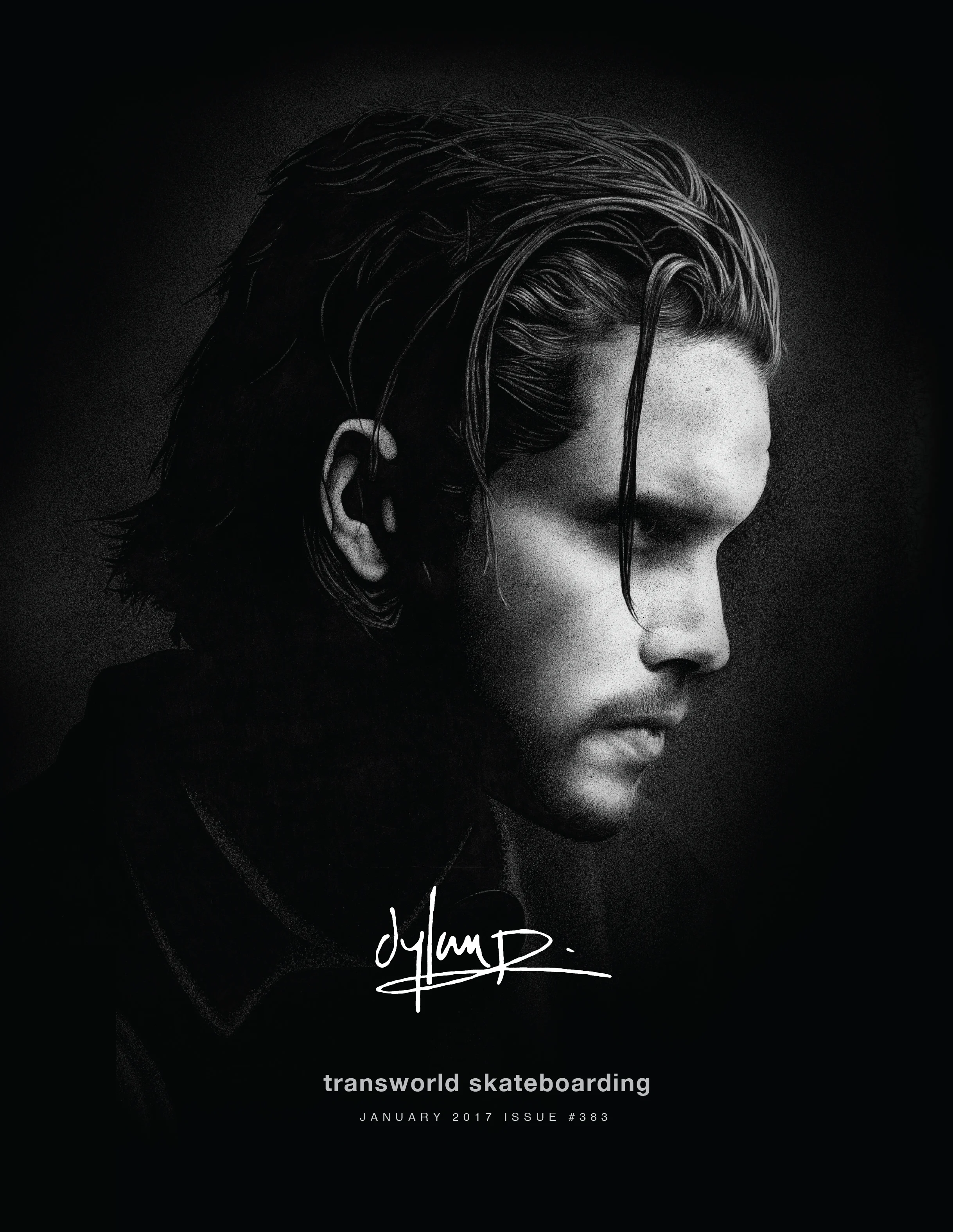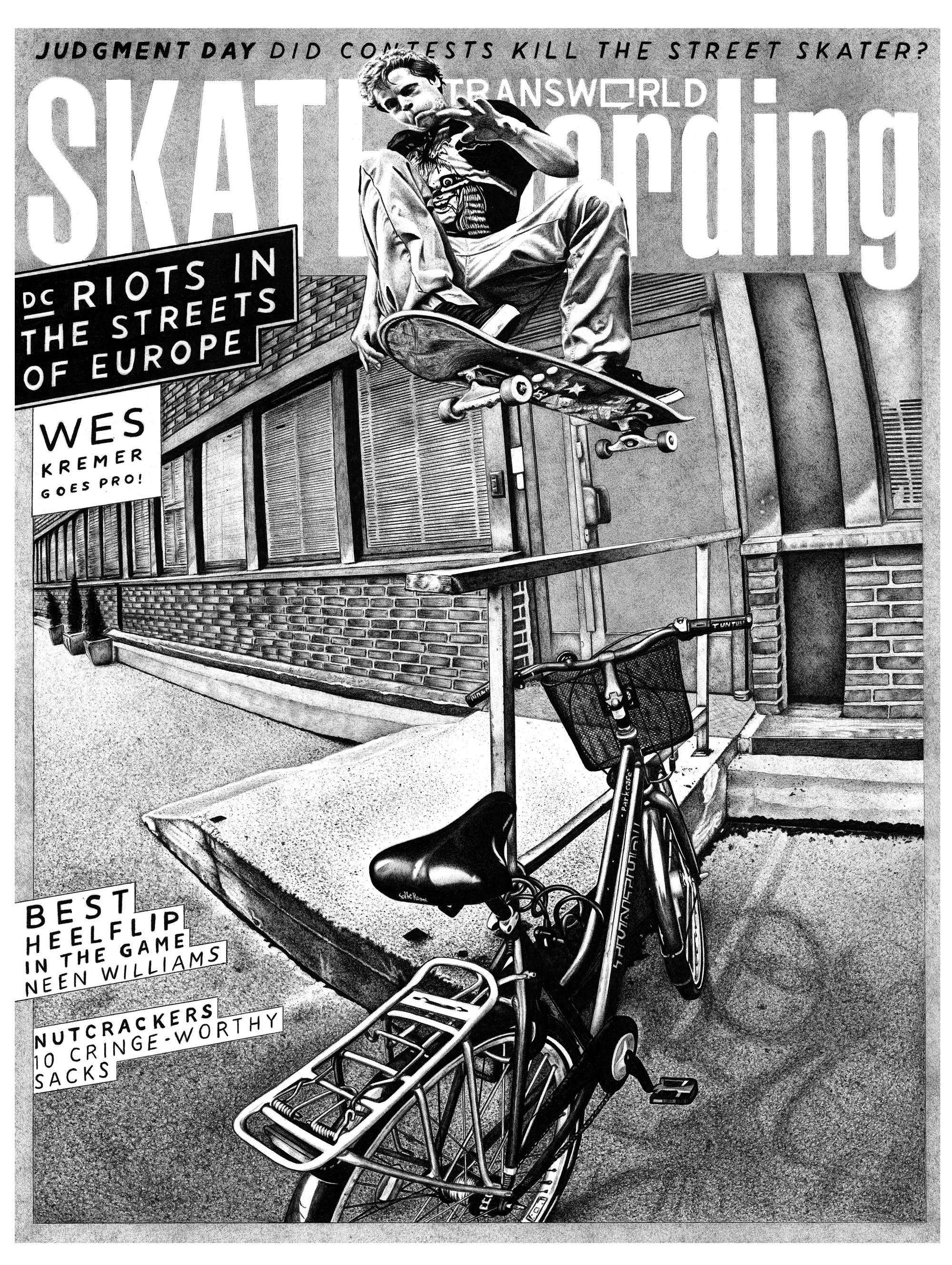 I really can't even describe how surreal that was for me. I've been reading TransWorld since 1988 when I was 12-years-old. Growing up skateboarding in a small town in Wisconsin, you never even think something like that could ever happen. It was obviously a huge moment for me, but the stoke was also mixed with a bunch of other emotions. Dylan had just passed the week before so it felt very strange to feel excited about an opportunity that resulted from such a tragedy. It took me a while to process that. Also I definitely felt that I wasn't worthy of the honor since I didn't really know Dylan, and also since I had only just started drawing again, with only three pieces under my belt at that point. All that, plus I was super nervous about being able to pull it off in such a quick timeframe. I had less than four weeks and these stipple drawings usually take me 3-4 months at my pace.
