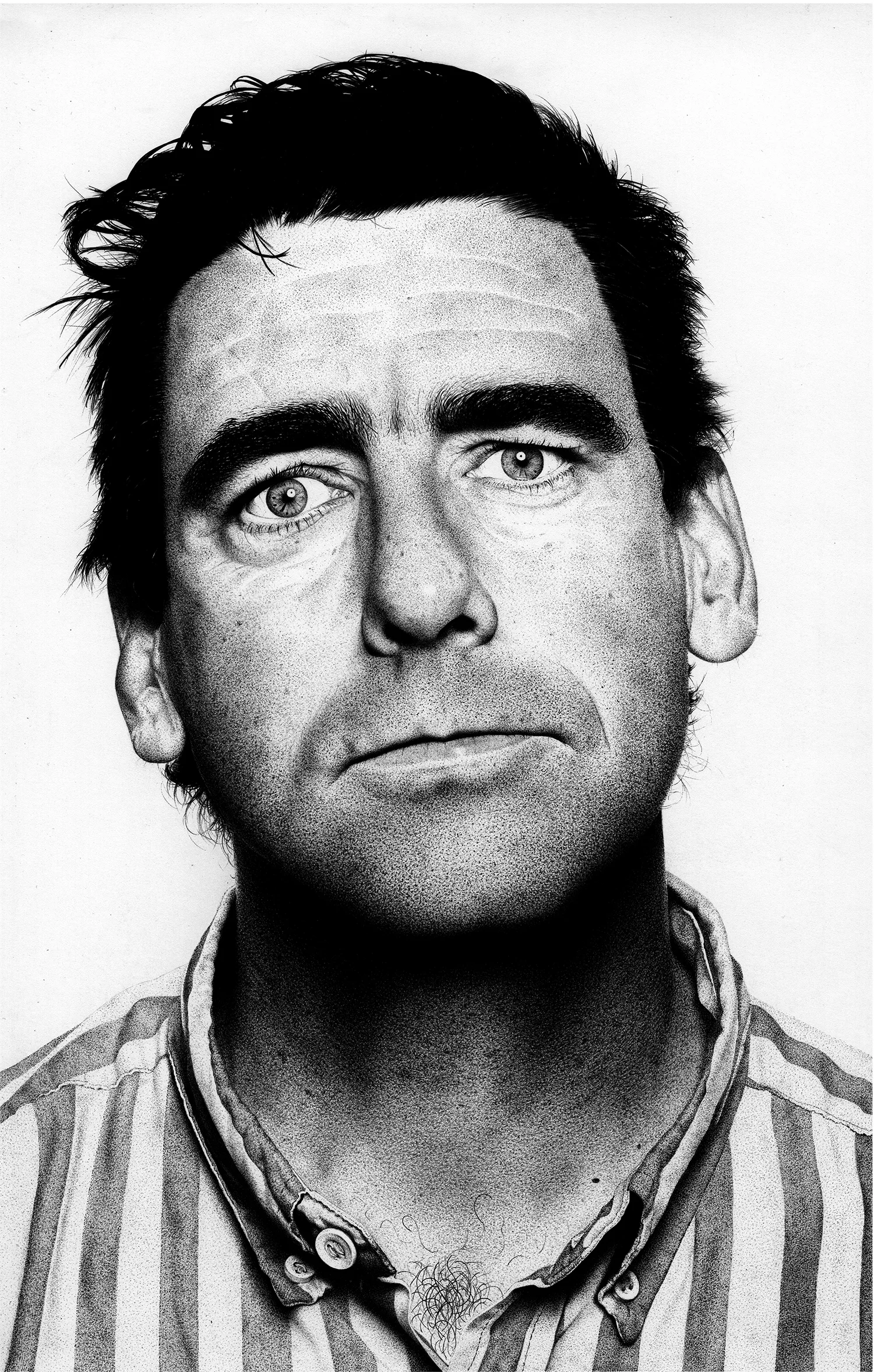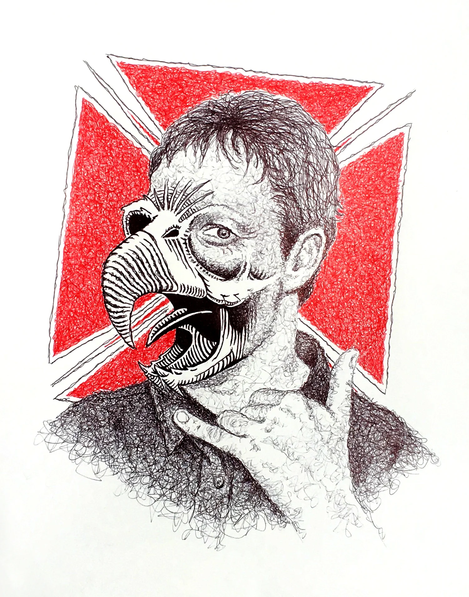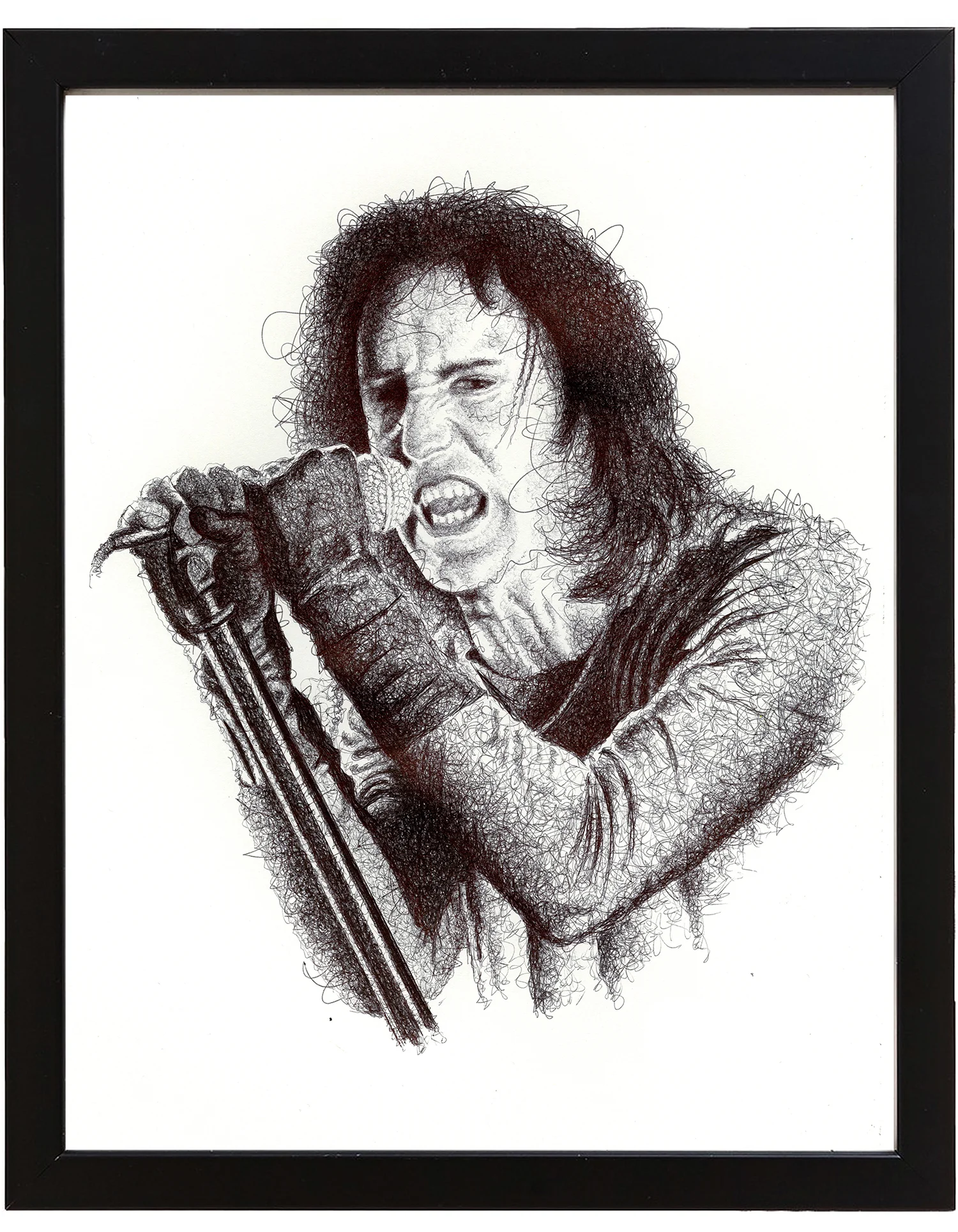 The stipple drawings are literally just one dot at a time. I spend maybe twenty minutes lightly drawing out the main features with pencil and getting the proportions right. Then I lay a print of the photo over the top of the drawing and flip it upside down while dotting it out with the pen. It takes around an hour or two per square inch depending on the detail. I have a busy day job and busy home life, so I usually don't start drawing until 8 or 9pm when the kids go to bed. Lately I've been doing these scribble drawings which only take a couple of days per piece. It’s so great to be able to complete a piece every few days instead of every few months, but I'm not sure I'm totally happy with the results. I'm still figuring out the technique. I don't like how long the realism drawings take, but I like the challenge of making a drawing look like a photograph and I'm definitely happier with the end results. The paradox is that the scribble drawings seem to sell better. Maybe it’s the subject matter.