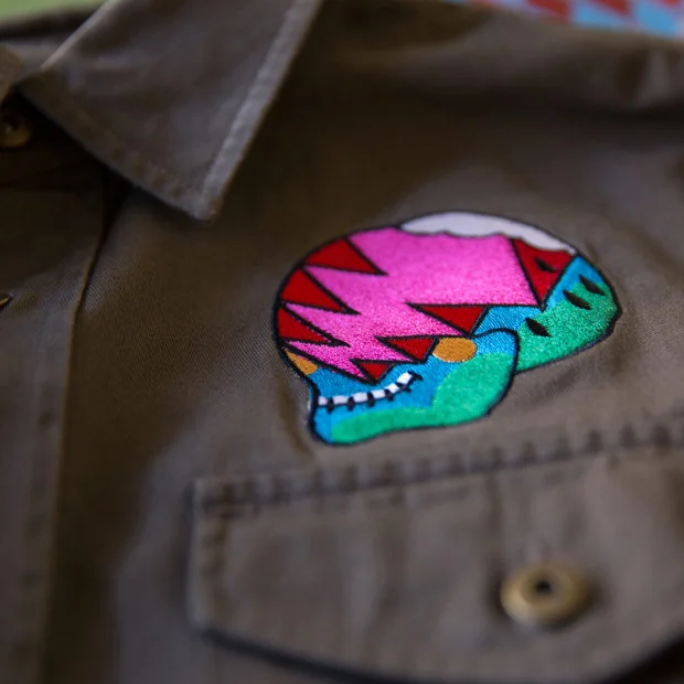 Then when I moved here we were going to orientation for my kid’s school and Andy and Jennifer were there with their kids. It just so happened that we had landed at the same school. I was doing a lot of painting and had this Wordpress blog where I was putting up images for a while. Andy saw the stuff, liked it, and asked if I would want to maybe do an artist capsule. I went over with maybe 25 drawings. It was funny I gave him one drawing that got put on a t-shirt, but the other drawings he just took some photographs of the drawings. They came up with the ideas of how to translate the ideas to clothing. I was psyched about the embroidery and they are super great pieces. I was really happy with their sense of design and getting it onto certain pieces of clothing not just random fabric.