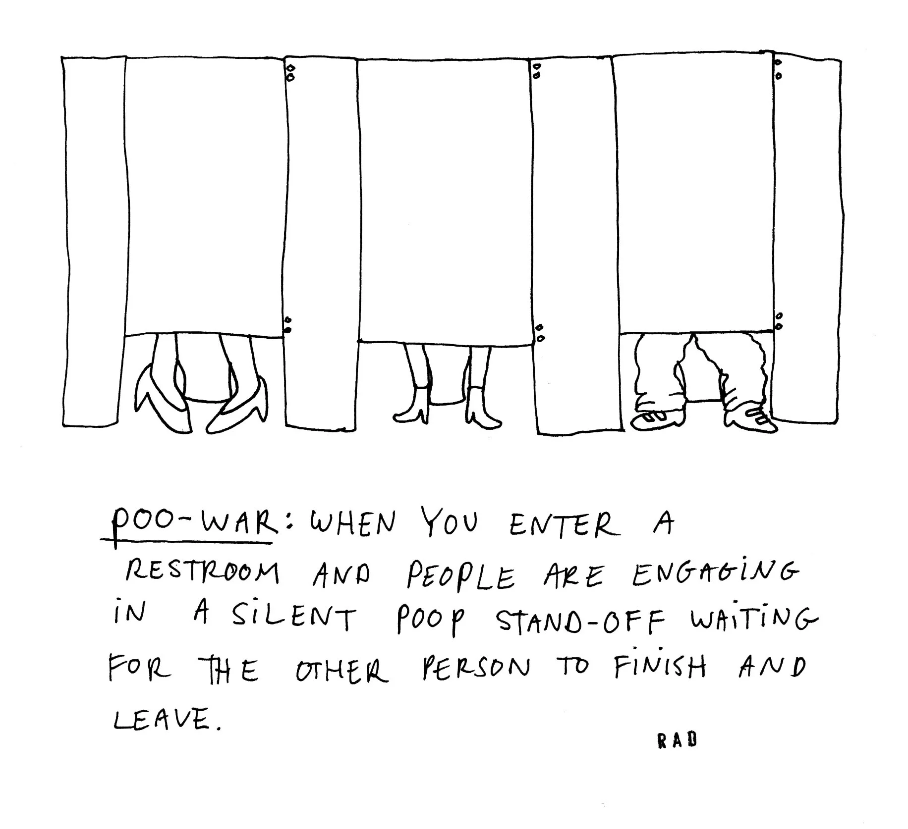 I am not a poo-war participant! If I have to poo, there is no waiting. I just poo. I love how full of shame people are that when they go to a bathroom (designed for pissing and shitting) they sit in silence because they are too afraid to do what they need to do in front of others. I get a crack out of people who rip ass super loud and groan. I guess those people are truly free.
